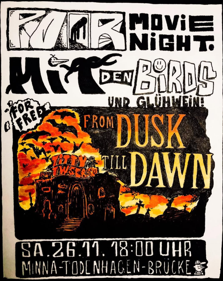 Am 26.11. fand eine super flippige Movienight statt 🤩 Wir projizierten mit Hilfe der neuesten Lasertechnik einen Klassiker der Filmgeschichte an die Wand. Jeder war willkommen, der gute Stimmung hatte und einen Stuhl besaß – andernfalls musste man auf dem Boden sitzen. Viele schnappten sich ihr Lieblingssitzelement, eine Decke oder etwas anderes Kuscheliges und kamen unter die Mina-Toden-Hagen-Brücke.